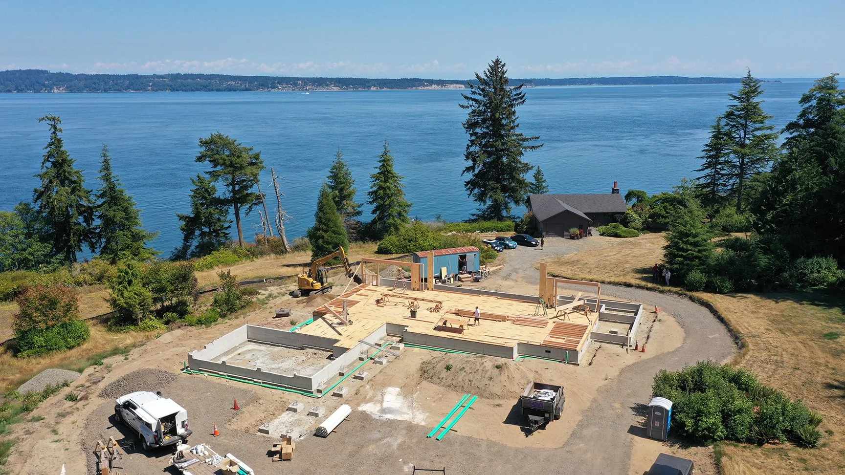 This interplay of compression and release is echoed in the home's layout. Visitors are guided along a covered walkway, passing through a low, intimate entryway before being greeted by a breathtaking panorama of the Puget Sound, framed by expansive glass.