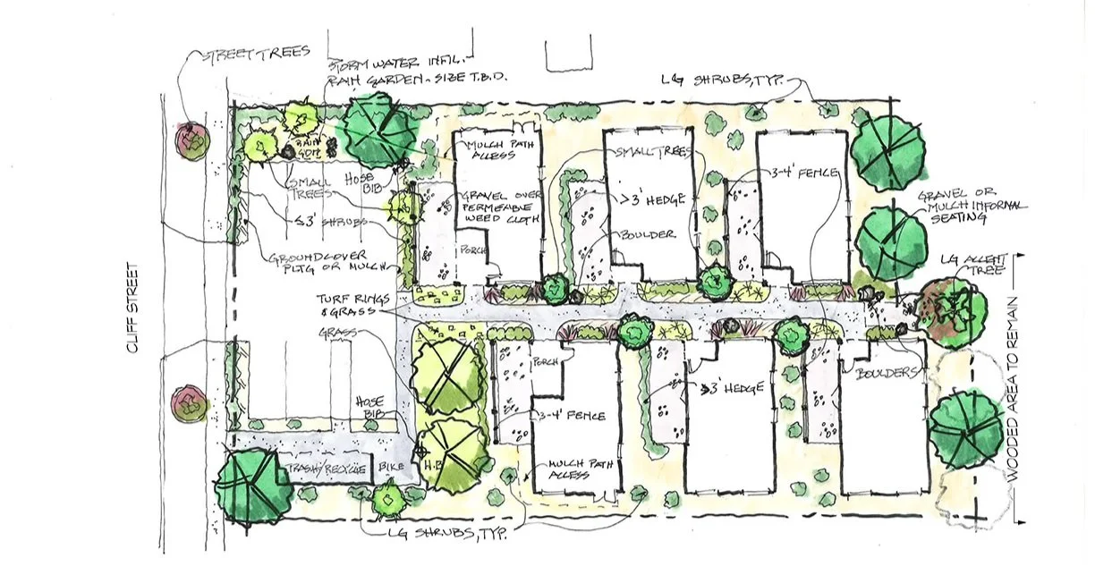 In partnership with Habitat for Humanity of East Jefferson County, this six-unit micro-neighborhood is designed to cultivate a strong sense of community while providing high-quality, permanently affordable housing for all residents. Developed under the City of Port Townsend’s Unit Lot Subdivision framework—a planning tool that allows for higher-density housing in traditionally lower-density zones—the project maximizes land use efficiency while maintaining a welcoming, neighborhood feel. Thoughtful site design preserves mature trees, incorporates accessible units, and includes on-site parking, low-impact stormwater management, and covered bike storage to support sustainable and inclusive living. The neighborhood is currently under construction - refer to Habitat for Humanity’s project webpage for more updates and information HERE.
